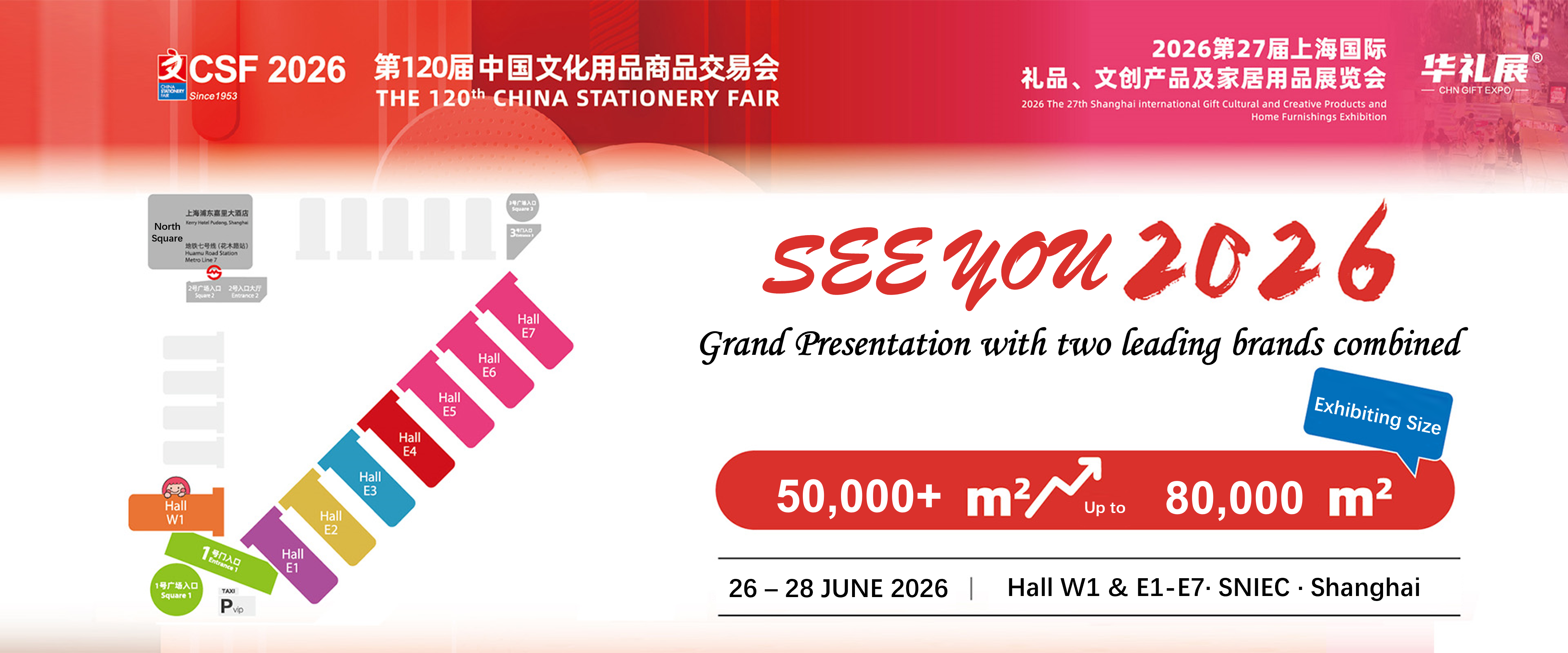 The 120th China Stationery Fair will join hands with the 27th CHN Gift Expo at Shanghai New International Expo Centre from June 26 to 28, 2026. The exhibition is expected to cover an area of 80,000 square meters, attracting more than 1,800 exhibitors and an estimated 100,000 visits.