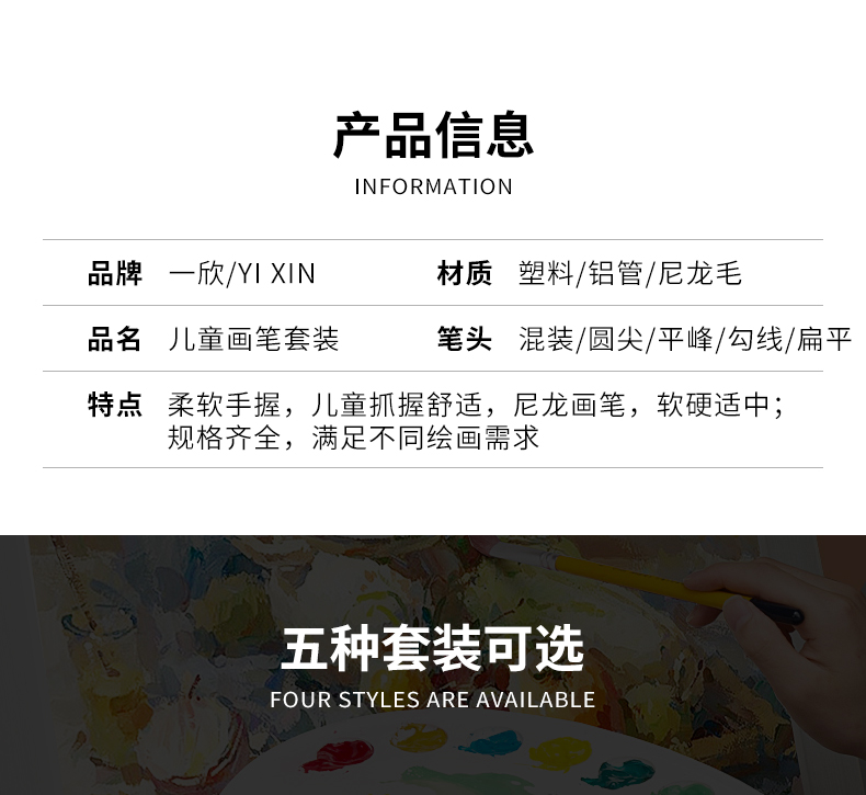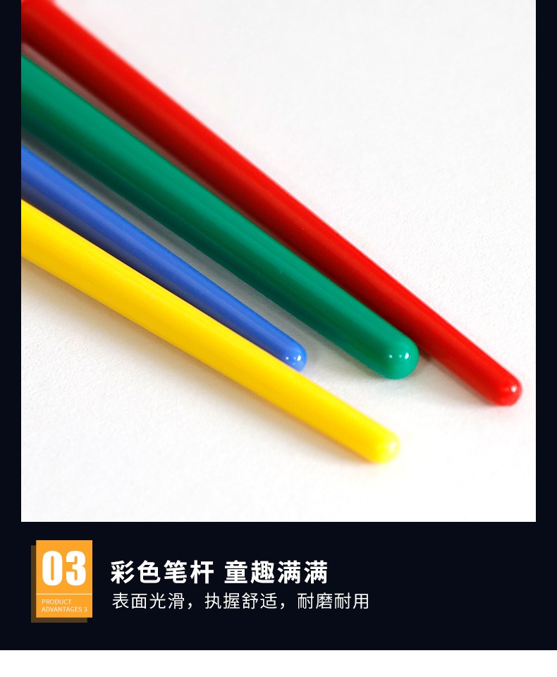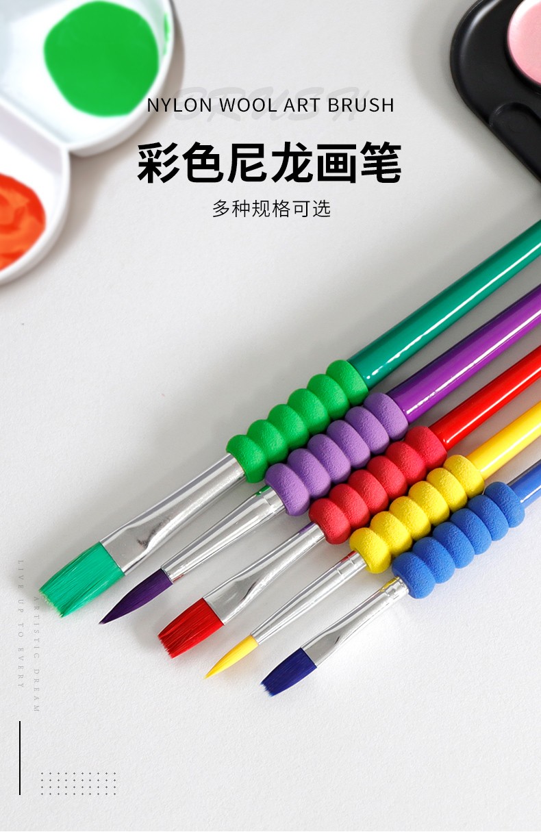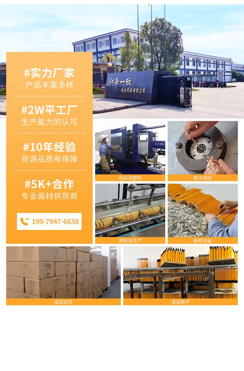 优质尼龙毛:弹性适中,吸水性好,不异分叉 金属铝管:双重紧扣,能够有效防止笔头脱落,光亮耐腐蚀 PS塑料笔杆:表面光滑,执握舒适,耐磨耐用 适合水粉画、丙烯画、油画作品,满足多种绘画需求