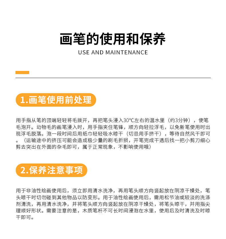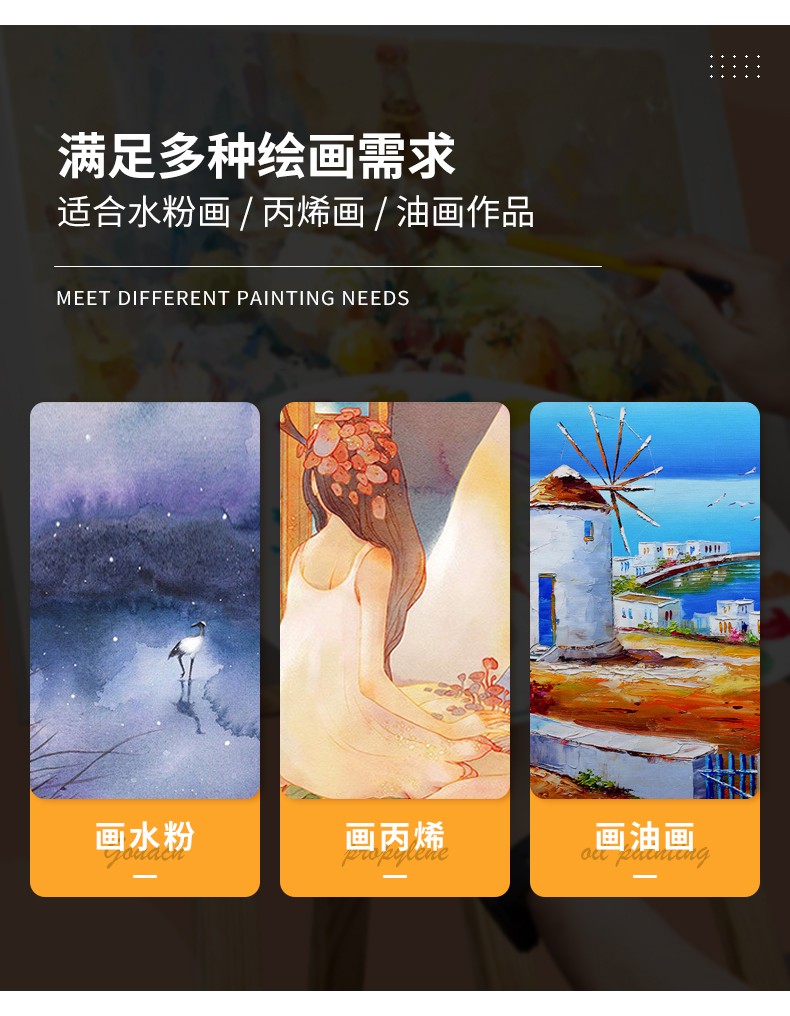 优质尼龙毛:弹性适中,吸水性好,不异分叉 金属铝管:双重紧扣,能够有效防止笔头脱落,光亮耐腐蚀 实木笔杆:光滑漆面,表面光滑,执握舒适,耐磨耐用 适合水粉画、丙烯画、油画作品,满足多种绘画需求