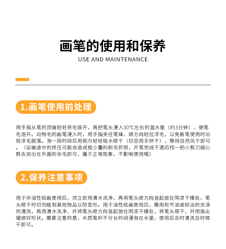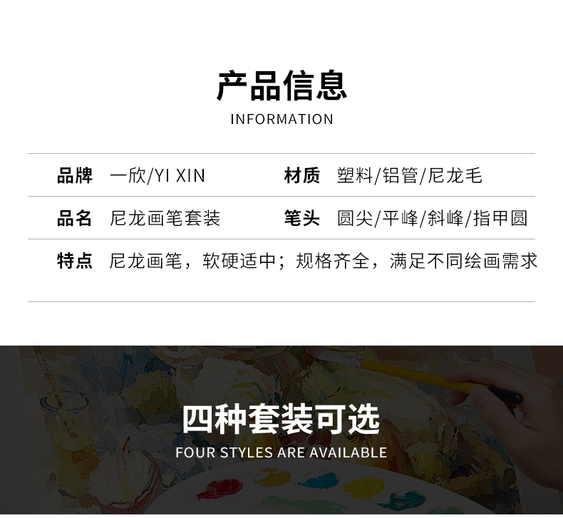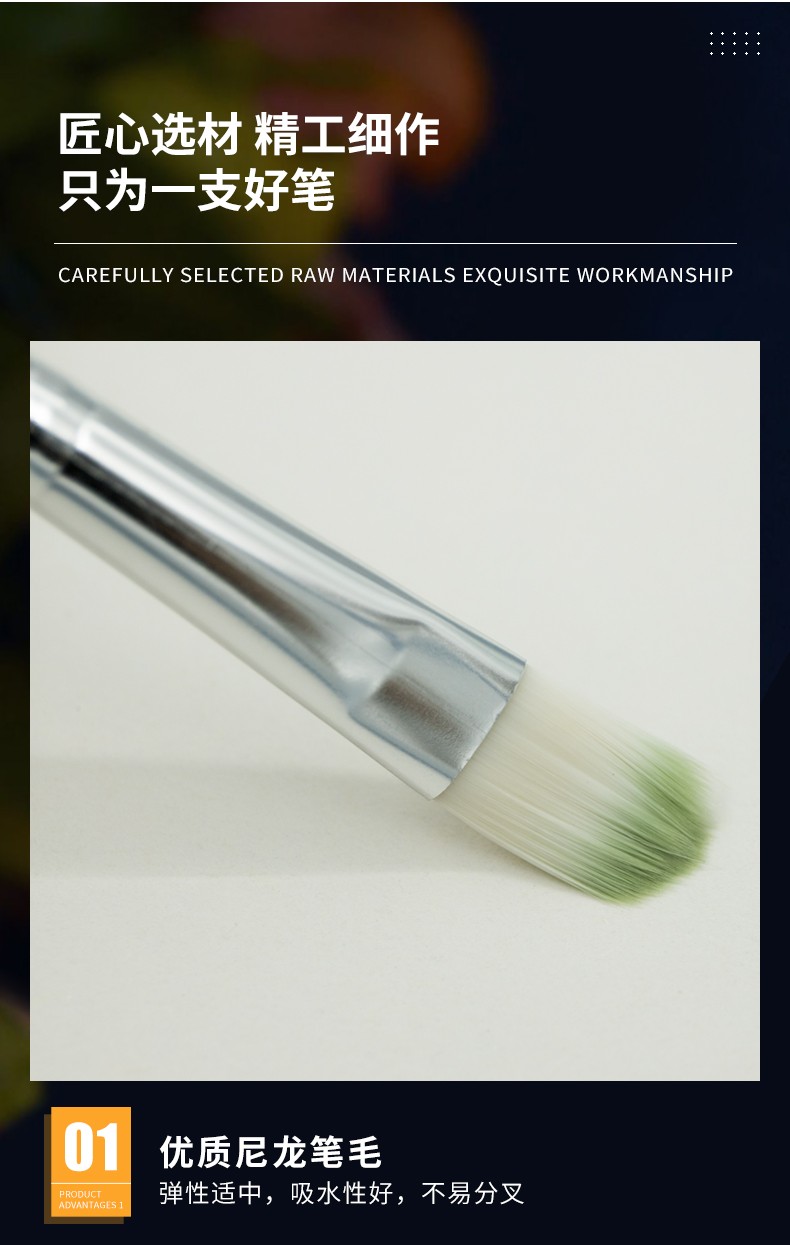 优质尼龙毛:弹性适中,吸水性好,不异分叉 金属铝管:双重紧扣,能够有效防止笔头脱落,光亮耐腐蚀 实木笔杆:光滑漆面,表面光滑,执握舒适,耐磨耐用 适合水粉画、丙烯画、油画作品,满足多种绘画需求