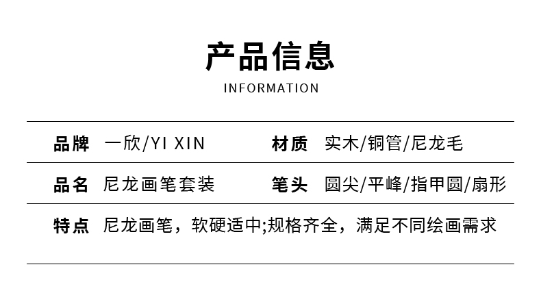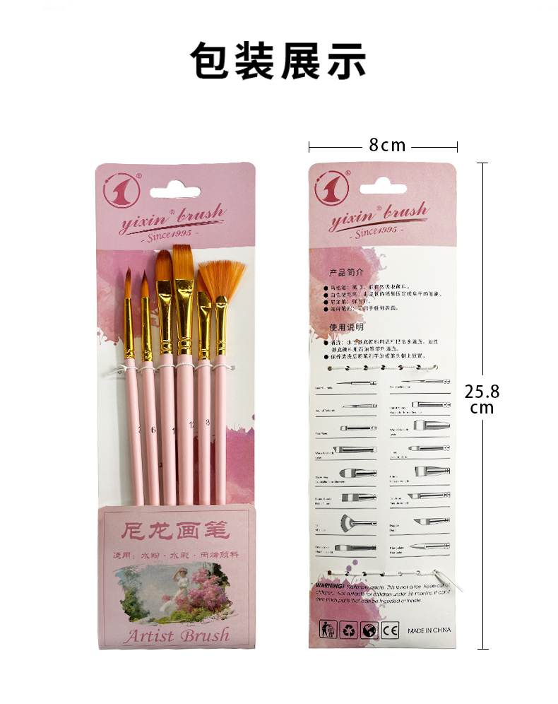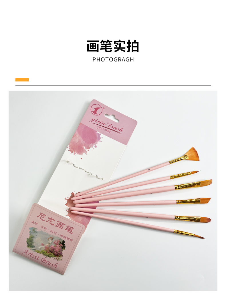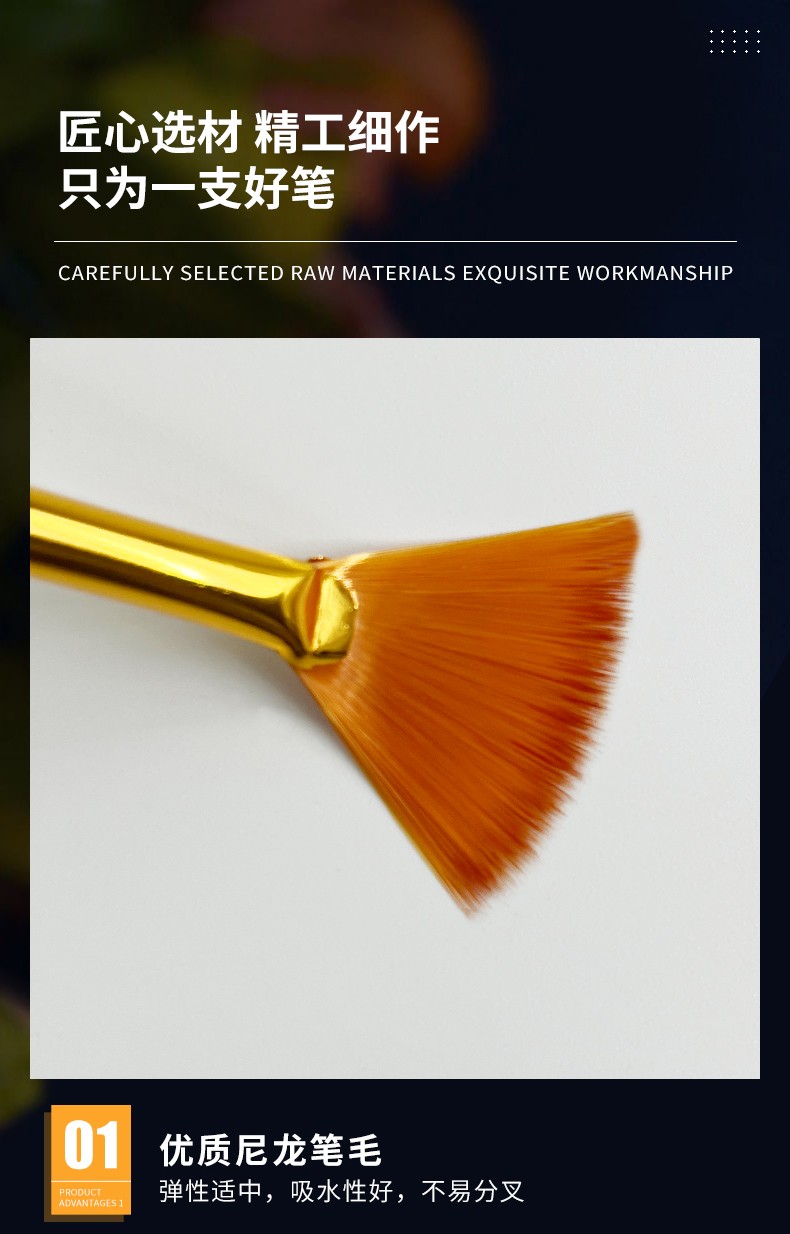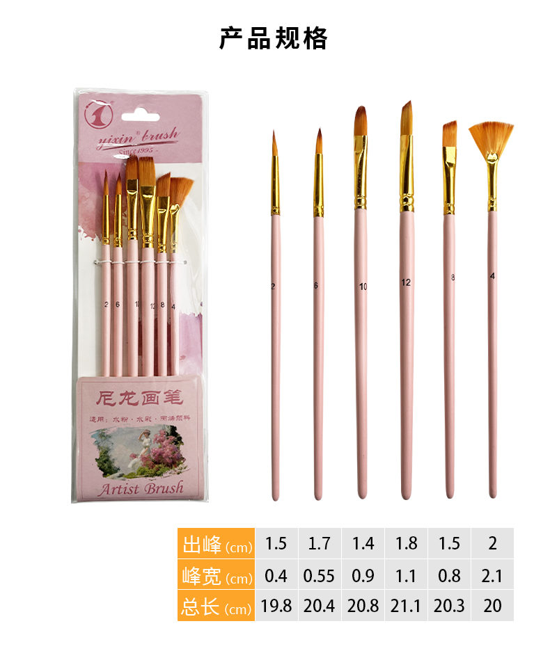 优质尼龙毛:弹性适中,吸水性好,不异分叉 金属铝管:双重紧扣,能够有效防止笔头脱落,光亮耐腐蚀 实木笔杆:光滑漆面,表面光滑,执握舒适,耐磨耐用 适合水粉画、丙烯画、油画作品,满足多种绘画需求