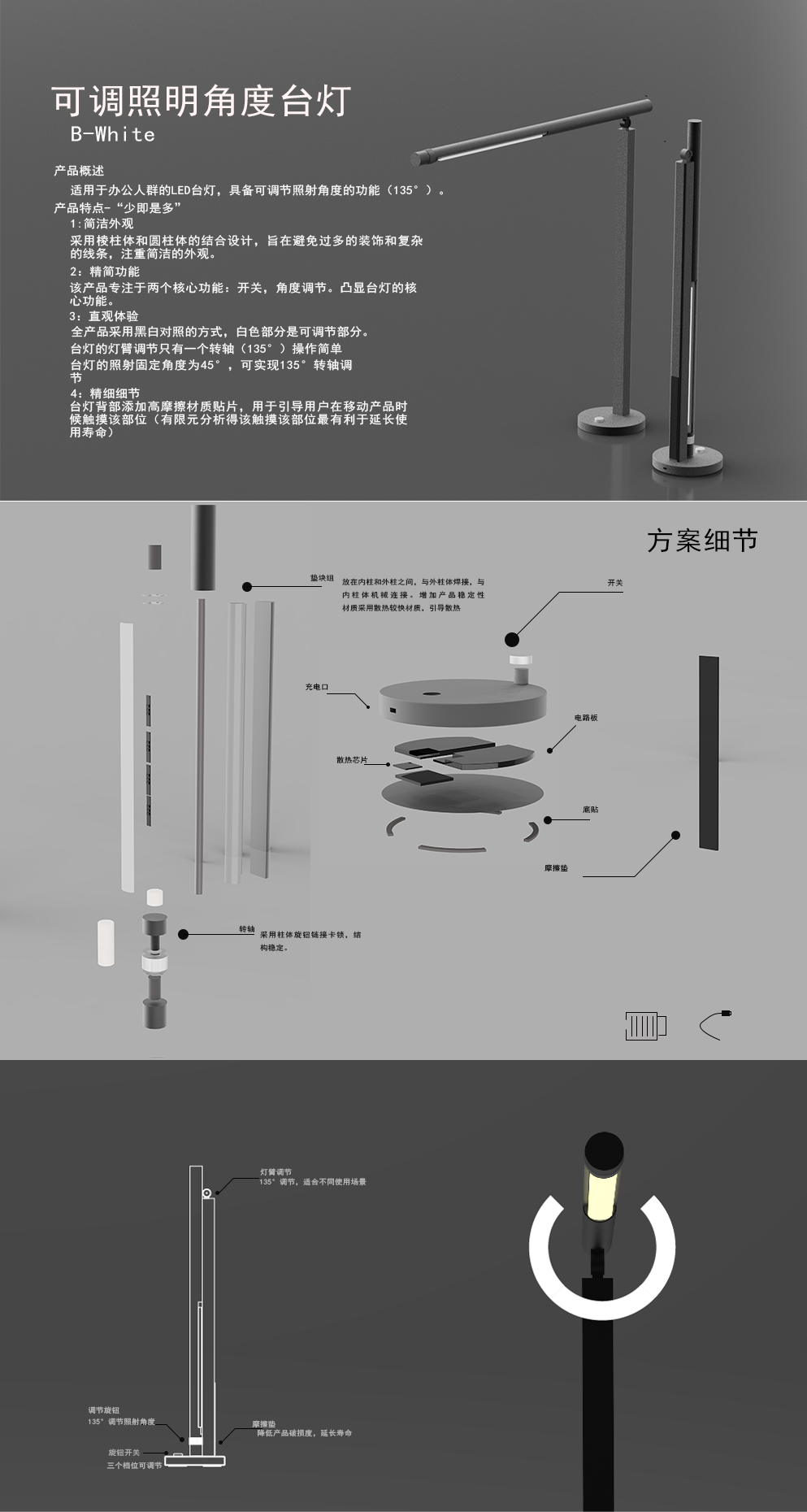 基本概述: 适用于办公人群的LED台灯,具备可调节照射角度的功能(135°)。 产品特点:“少即是多” 1:简洁外观: 采用棱柱体和圆柱体的结合设计,旨在避免过多的装饰和复杂的线条,注重简洁的外观。 2:精简功能: 该产品专注于提供两个核心功能:开关和照射角度调节。这种设计使得台灯的功能更加纯粹,突出了其核心功能。 3:直观体验: 全产品采用黑白对照的方式,白色的部位是可以调节的部分,易于识别操作。 台灯的灯臂调节只有一个转轴(135°)操作简单易用。 台灯的照射固定角度为45°可实现135°转轴调节。 4:精细细节: 台灯背部添加高摩擦度材质贴片,用于引导用户在移动产品时触摸该部位,经过有限元分析确定该部位对产品寿命影响最小。