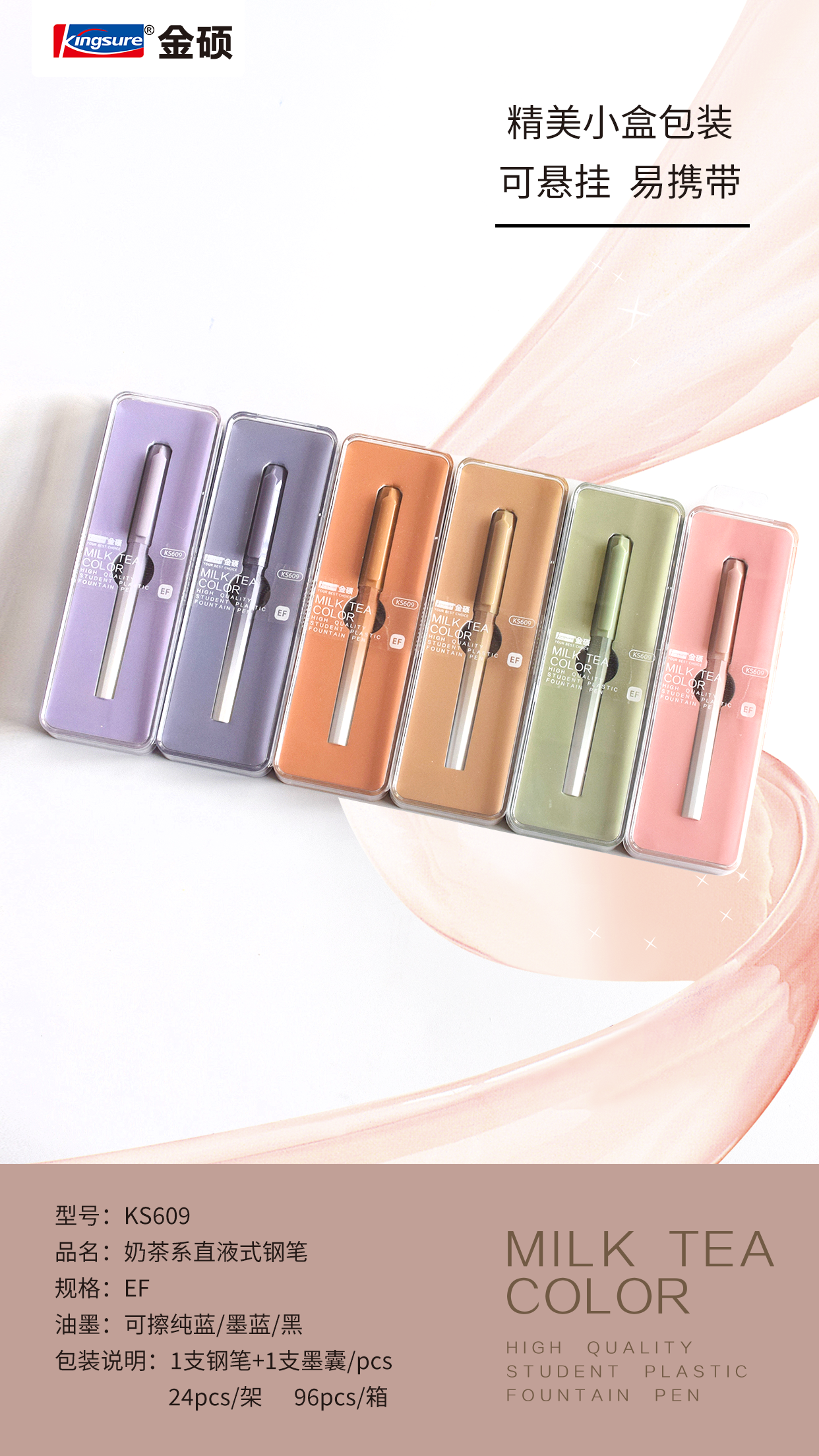 :奶茶系直液式钢笔 奶茶色系渐变 搭配多棱面笔身 灵动闪耀 娇姿握杆 经典EF细笔尖 久写不累 油墨颜色有可擦纯蓝、墨蓝、黑色可选 盒装有1支笔+1支墨囊,24pcs/展架,96pcs/箱 展品详情:奶茶系直液式钢笔 奶茶色系渐变 搭配多棱面笔身 灵动闪耀 娇姿握杆 经典EF细笔尖 久写不累 油墨颜色有可擦纯蓝、墨蓝、黑色可选 盒装有1支笔+1支墨囊,24pcs/展架,96pcs/箱