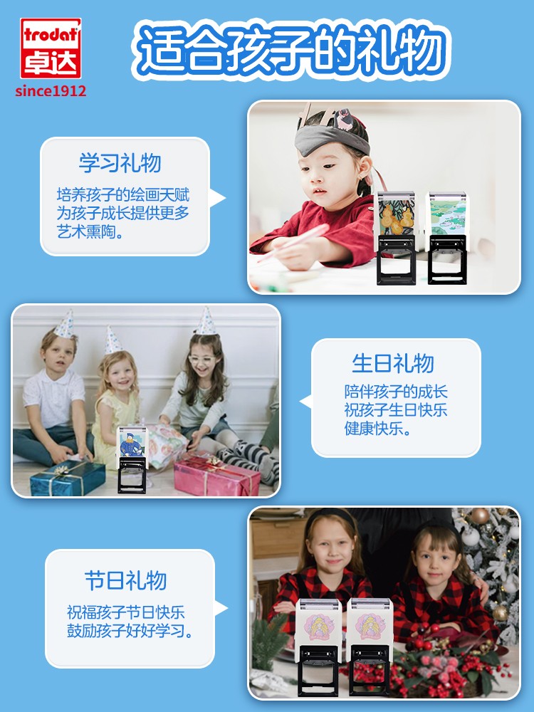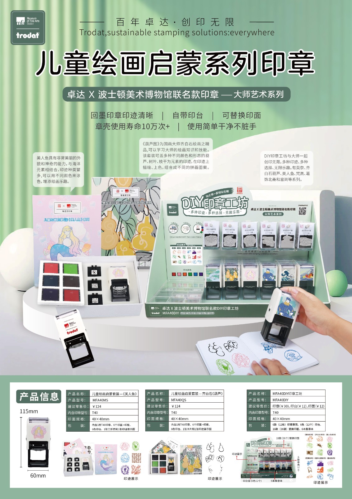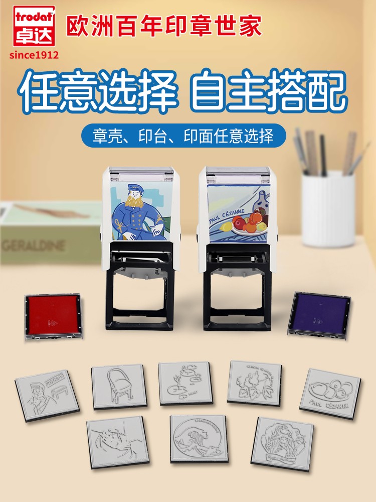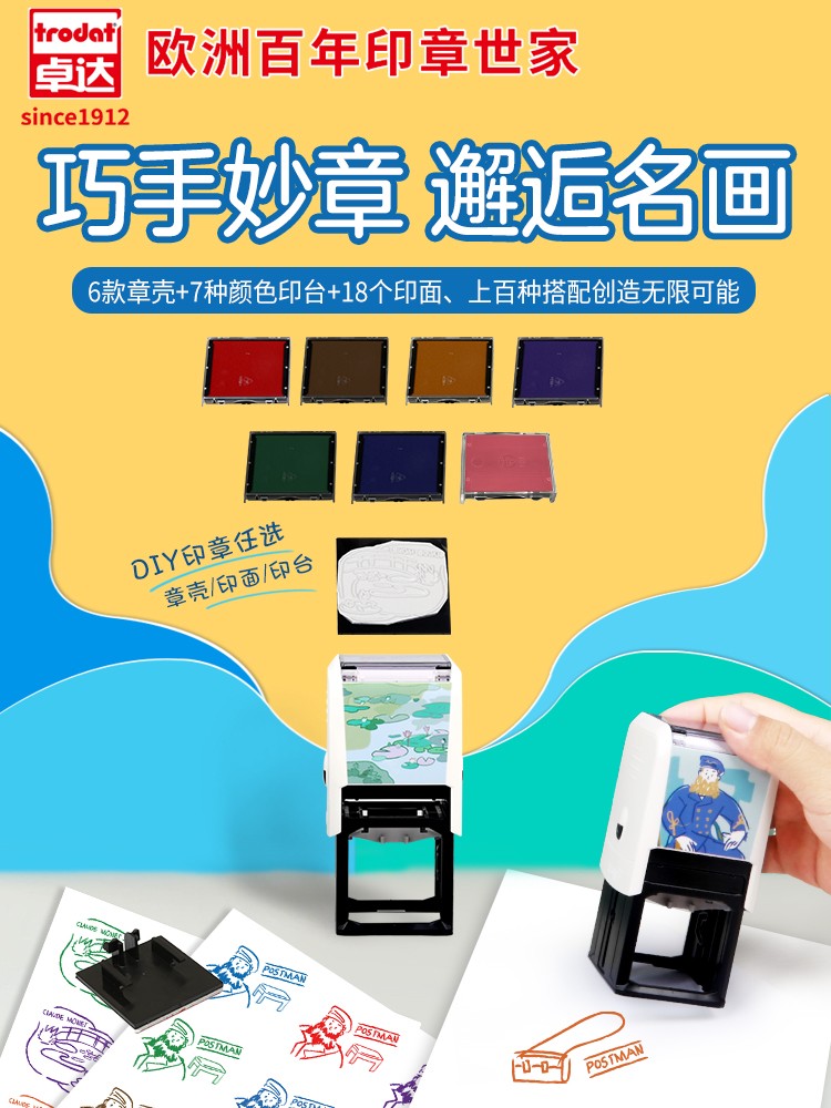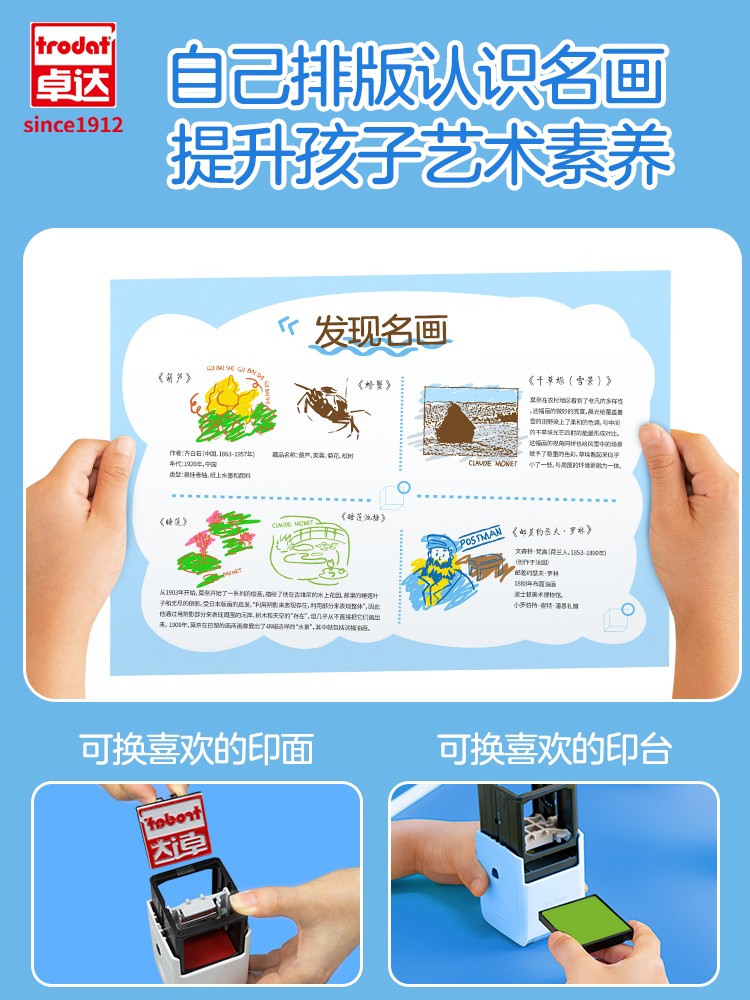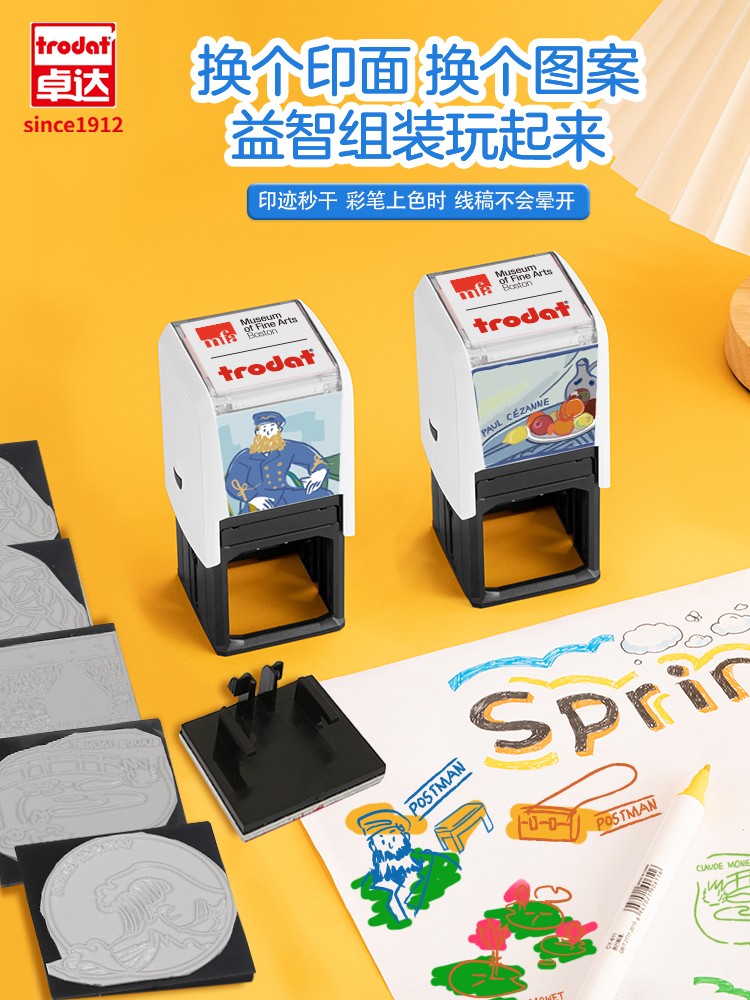 卓达X波士顿美术博物馆联名款印章——大师艺术系列 回墨印章,激光立体雕刻,印迹清晰; 大师名画元素提取,让孩子邂逅名画; 自带印台,多种颜色可选; 章壳使用寿命10万次+,性价比更高; 使用简单、干净、不脏手; 可替换印面,DIY自己的印章, 盖印后可以使用彩铅、水彩笔等涂色, 可以DIY钥匙扣、徽章、冰箱贴、礼品包装纸等各种衍生品,玩法多多,乐趣多多。