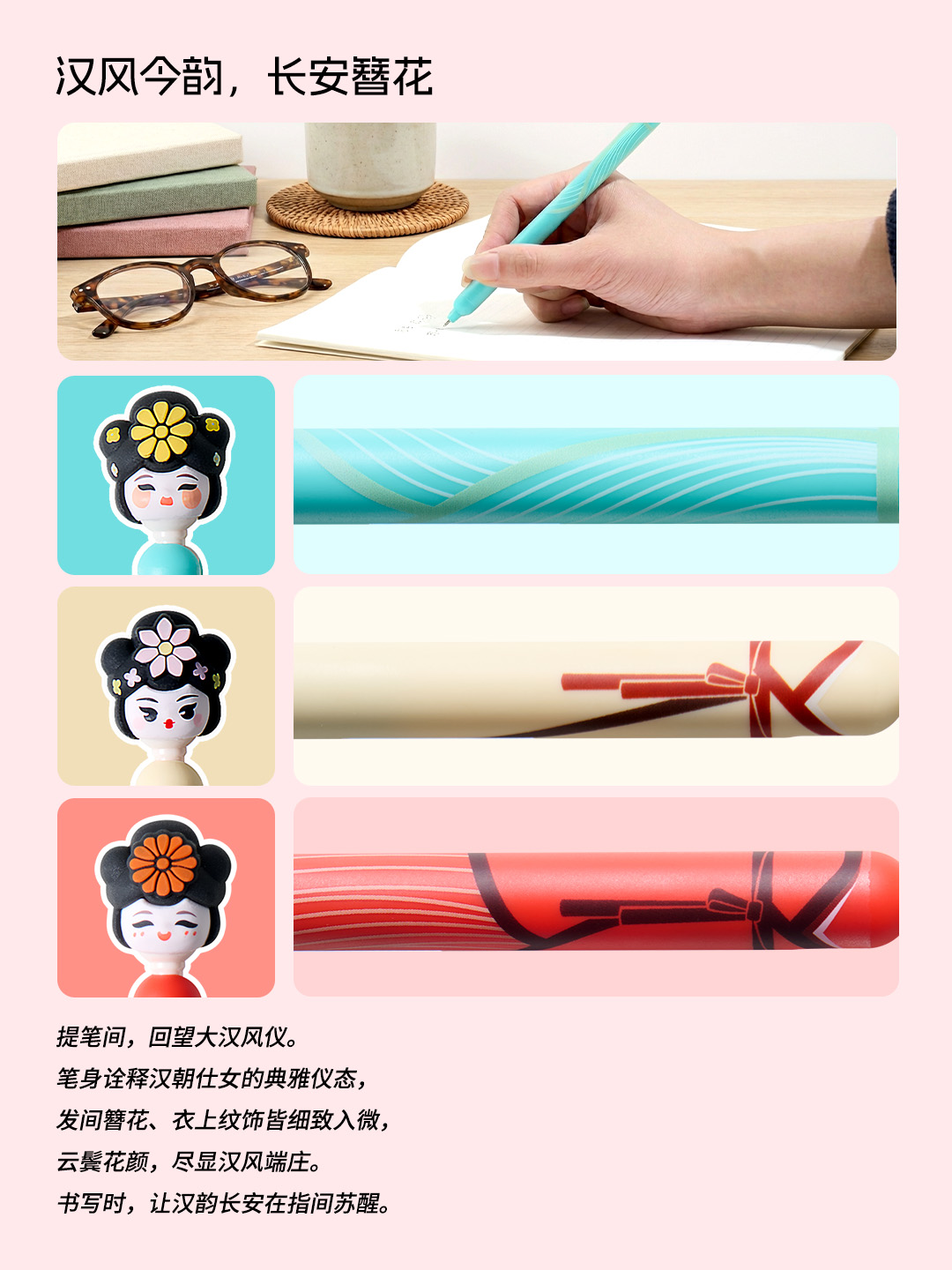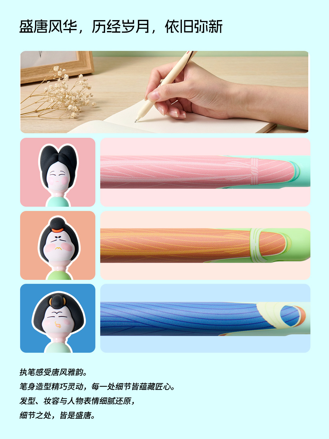 Inspired by the "Group Statues of Maidservants from the Eastern Han Dynasty" and the "Painted Pottery Maidservants from the Tang Dynasty", we have integrated the gentle elegance of cultural relics into the pen body design. This allows culture to flow from the nib into daily life, and awakens the thousand-year-old cultural context of national treasures quietly with every stroke of writing.