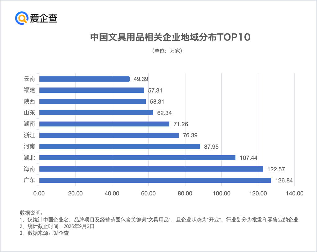 Data sourced from Aiqicha reveals that there are currently over 10 million stationery-related enterprises in China, witnessing a steady growth in registrations over the past decade. Notably, approximately 2.504 million new enterprises have been registered within this year alone. In terms of geographical distribution, Guangdong Province tops the list with around 1.2684 million registrations, closely followed by Hainan Province with approximately 1.2257 million.